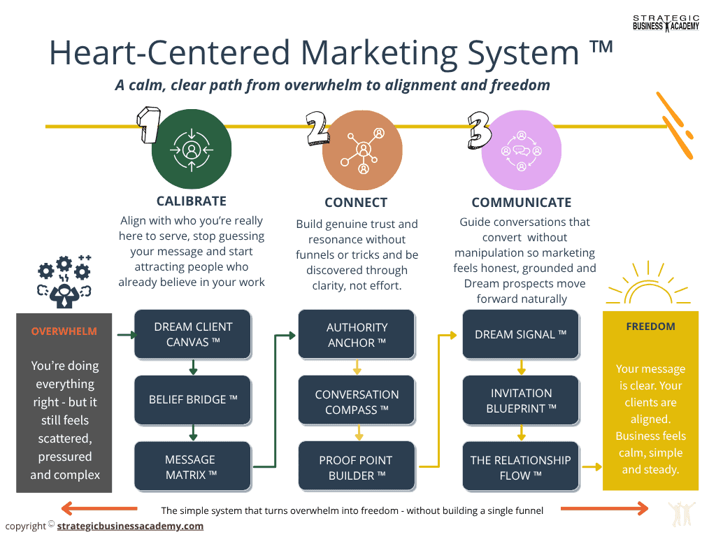 "So many heart-centered, purpose-driven entrepreneurs, experts, coaches and service professionals feel stuck and frustrated with "standard" (read: pushy and salesy) marketing and tactics to grow their business. They are goal-oriented but have endless ideas & options.